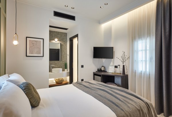 Room 3 overlooking our inner courtyard is ideal for two guests who want a dreamy stay in the historic center of Ioannina. It is located on the elevated ground floor of the building and is decorated in its own distinct style, which balances the authentic identity of the house with modern architecture.